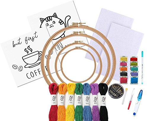 Threads Full Set Embroidery Starter Cross Stitch Kit Complete with Project Ebook - DIY 50 Threads, 2 Pre-Printed Patterns, 2 Pieces 28 by 20-inch 14 Count Aida, Bamboo Hoops